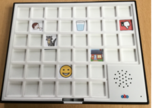 Nous le trouvons utile comme une aide technique d’approche, au sein d’un service ergo/ortho, destiné aux personnes susceptibles de pointer du doigt des cases de 42/42 mm, pour restituer des messages enregistrés, mais limités à 44, d’une durée maximale de 10 secondes.