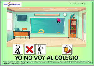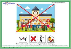 On y retrouve des images sous-titrées avec des pictogrammes ARASAAC pour expliquer pourquoi les enfants ne vont pas à l’école et ce qu’ils peuvent faire à la maison.