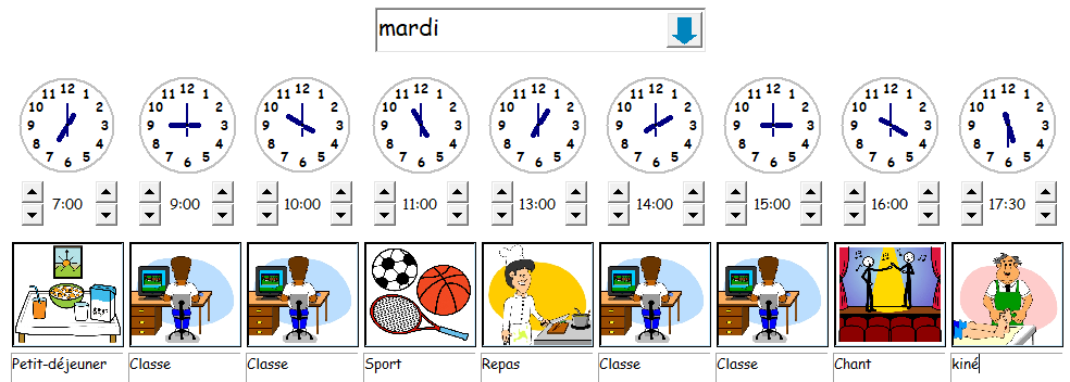 Chaque planche imprimable permet d’associer des pictogrammes, images ou photos, aux différents moments de la journée, matérialisés par une horloge digitale et à aiguilles.