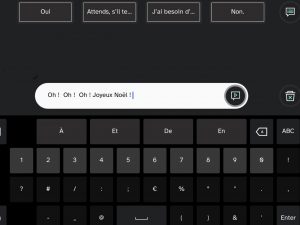 En scrollant du bas du clavier vers le haut (barre espace jusque T), on aura accès à la roue dentée des paramètres pour sélectionner la langue, la voix – 4 voix francophones : 2 voix de femmes (1 française et 1 canadienne), 2 voix françaises d’homme – et configurer le clavier.