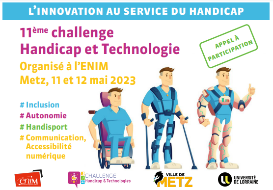 L’ENIM (Ecole Nationale d’Ingénieurs de Metz), en association avec l’Université de Lorraine et la ville de Metz, organisent en mai 2023 la 11ème édition du Challenge Handicap et Technologie .