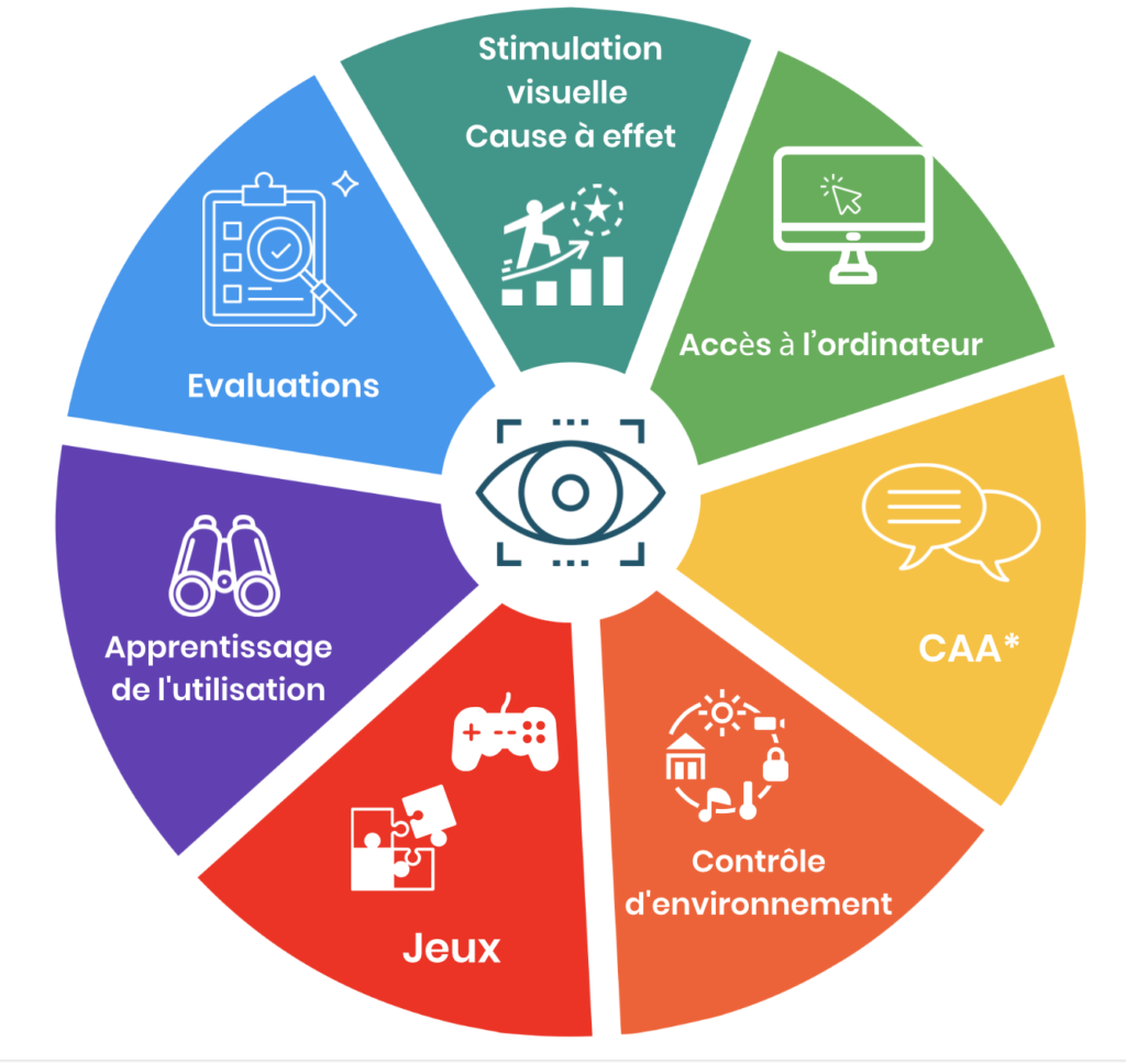 Couplé au logiciel adéquat, un eyetracker est très utile pour compenser une situation de handicap complexe. Dans ce contexte, la poursuite oculaire est fréquemment associée à la communication alternative et/ou améliorée (CAA).