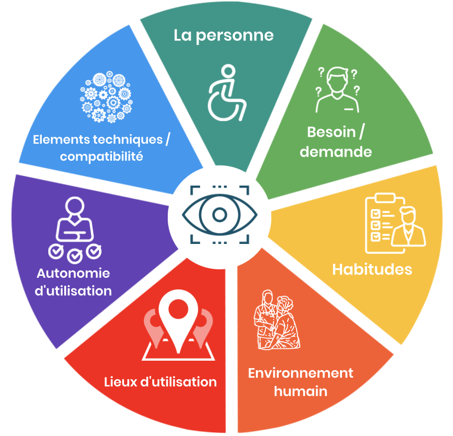 Il est également important de lister l’ensemble des contextes d’utilisation : au travail, à la maison, à l’école, en structure, dans un lieu public… Les contextes pourront changer en fonction de l’emploi du temps de la personne. On considérera, de ce fait, les contraintes liées aux transferts, au transport, à la multiplicité et la diversité des aidants, etc…