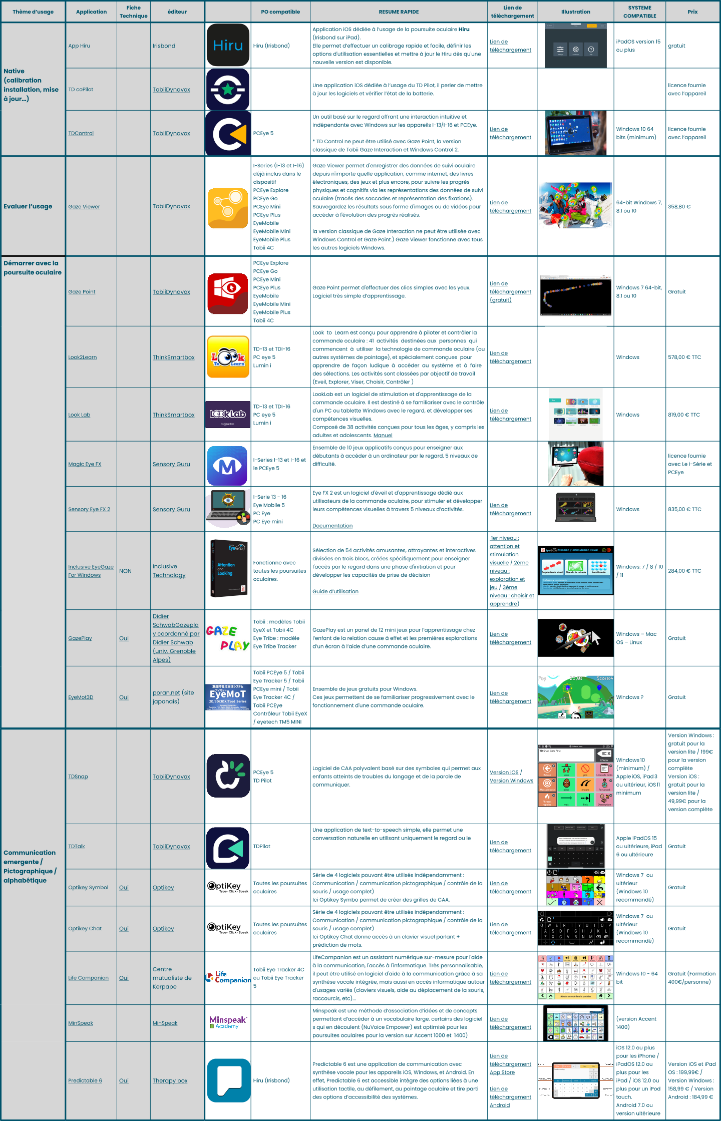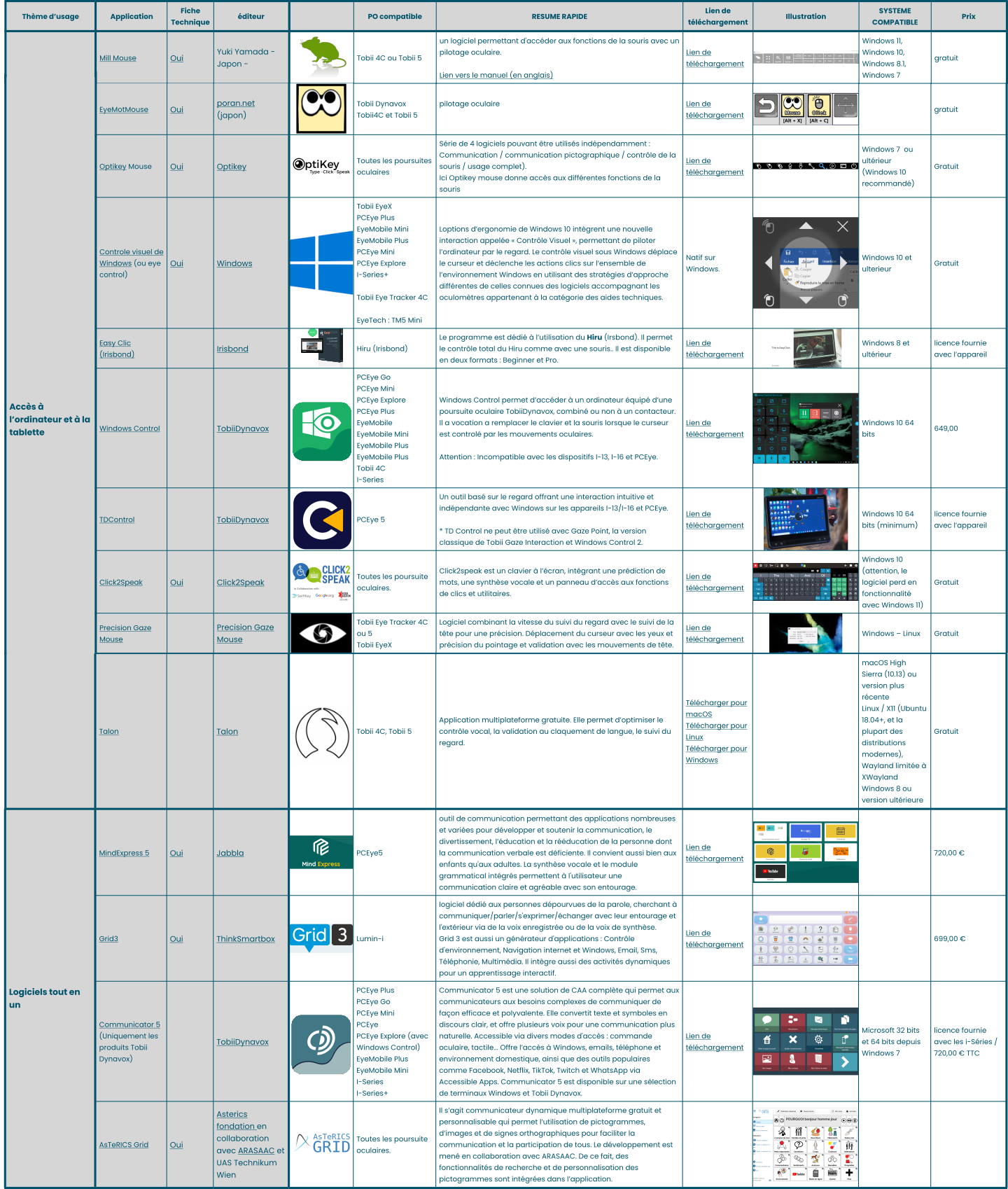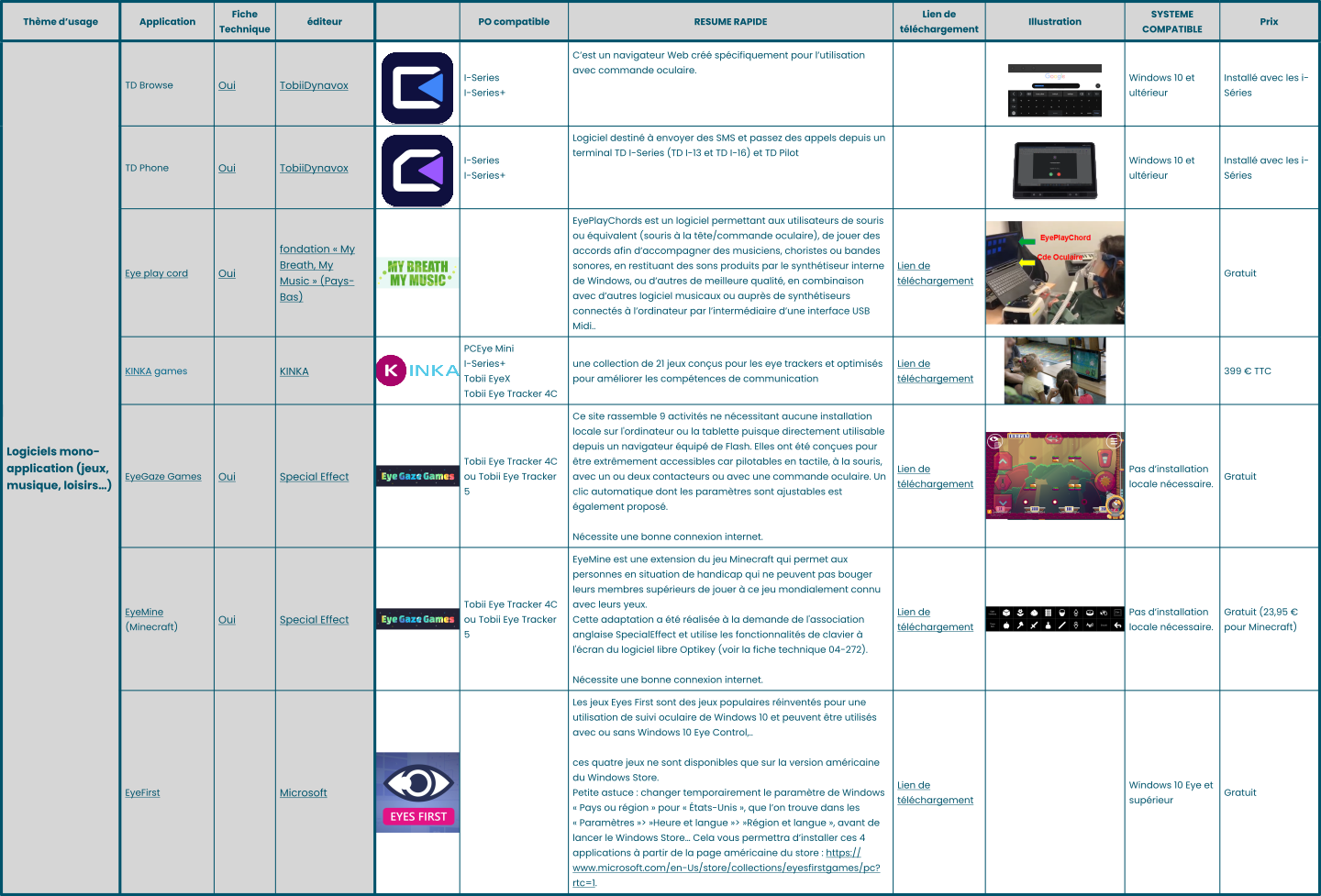 Pour chaque catégories d’usage, nous avons recensé les logiciels dits “optimisés” pour la commande oculaire.