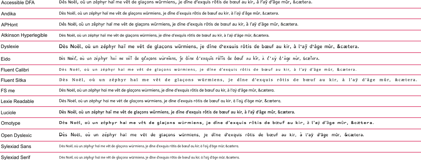 La phrase choisie pour illustrer chacune des polices est un pangramme, c’est-à-dire une phrase contenant l’ensemble des lettres y compris les caractères accentués ou spécifiques à la langue française (œ…).