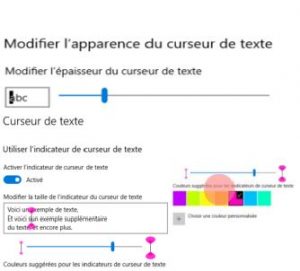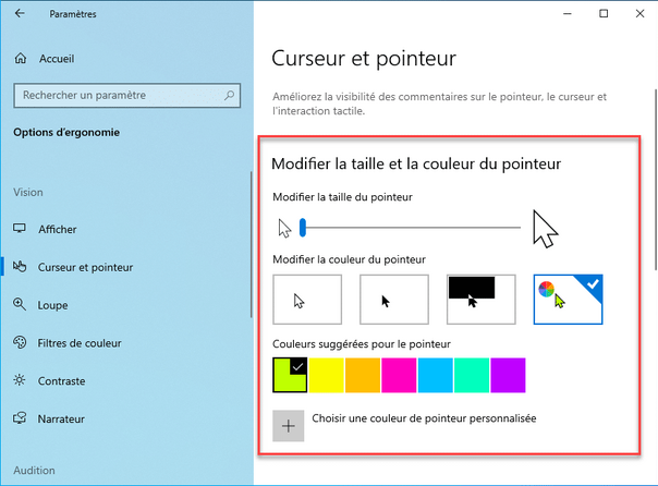 Il suffit de se rendre dans les Options d’ergonomie, puis sous l’onglet “Vision”, puis sélectionner “Curseur et pointeur”.