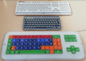 Déjà disponibles, les stickers de clavier permettent au jeune en apprentissage de faire plus rapidement la correspondance entre la lettre affichée à l’écran et sa localisation sur le clavier en fonction de sa couleur (vert, bleu et rouge).