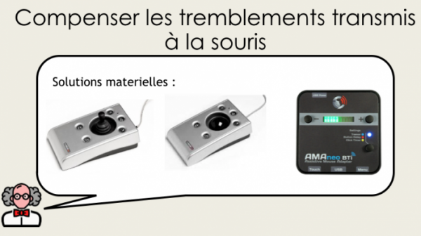 Il existe sur le marché des aides techniques de nombreux joystick adaptés aux personnes en situation de handicap : adoptant la préhension d’un manipulateur de fauteuil roulant électrique, sensibles, parfois équipés de guides doigts et offrant la possibilité de brancher des contacteurs correspondants aux fonctions clics, cette famille de périphériques déclenchent spontanément  le déplacement du curseur de la souris sans nécessiter de logiciel annexe dès leurs connexion en port usb.
