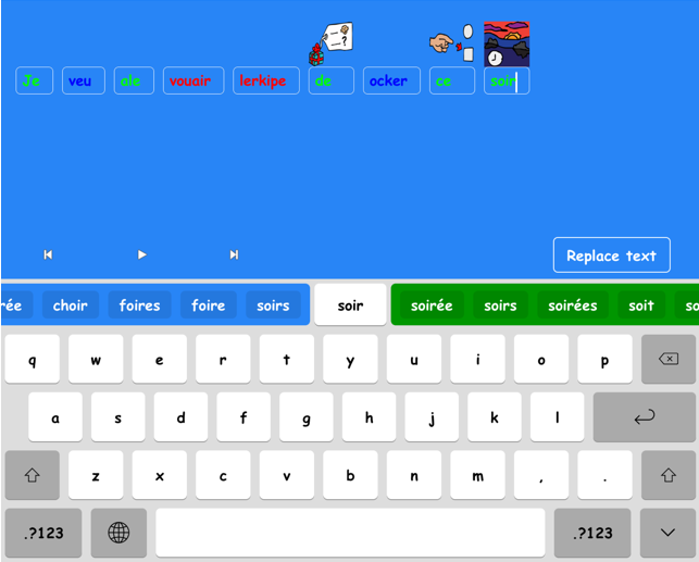 Sous iOS, les prédictions orthographiques (en vert) et phonétiques (en bleu) occupent la première ligne du clavier. Un mouvement de glissement horizontal sur le clavier modifie le style de la ligne prédictive. Le même mouvement sur la ligne de prédiction fait apparaître la suite des prédictions avec les illustrations associées aux prédictions phonologiques.