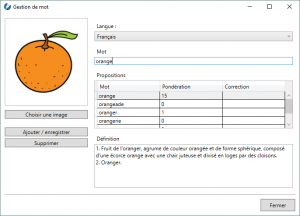 L’appui sur un mot de la liste déclenche sa lecture par voix de synthèse, deux appuis l’importent dans le champ de texte.