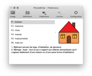 PhonoWriter est un logiciel gratuit, d’aide à l’écriture pour les « dys », traitée dans la fiche technique 04-313. Il est disponible pour Windows, Mac, Android et iOS. PhonoWriter propose ainsi différents types de prédictions de mots : classique, pictographique, phonétique, floue et de phrase.