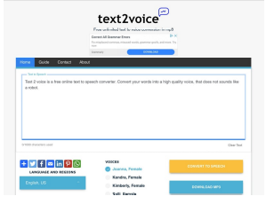 Text2voice est un service en ligne permettant d’obtenir une retranscription par voix de synthèse d’un texte écrit copié collé dans son interface. Text2voice propose une vingtaine de langues, toutes de très bonne qualité, accepte en version gratuite la retranscription d’un texte inférieur à 1000 caractères (ce qui est assez court), et propose le téléchargement en fichier audio du texte retranscrit.