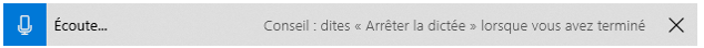 Ce raccourci fait apparaître la fenêtre de dictée (ci dessous), après quoi, un clic sur l’icône du microphone déclenchera l’écriture du texte prononcé au point d’insertion.