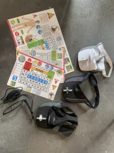 Le pointeur laser se positionne sur une branche de lunettes ou une visière. Il permet de diriger un faisceau lumineux vers un tableau de communication imprimé composé de lettres et de pictogrammes personnalisé.
