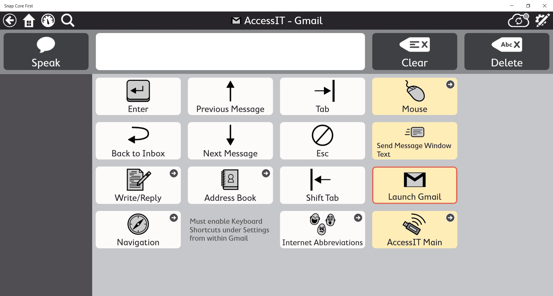 Il est possible de télécharger un ensemble de pages et boutons déjà conçues pour AccesIt sur mytobiidynavox en recherchant dans pageset central « Access It package page ». Ces jeux de pages contiennent les commandes nécessaires pour envoyer les touches et les commandes de déplacement de la souris à l’ordinateur auquel vous souhaitez accéder.