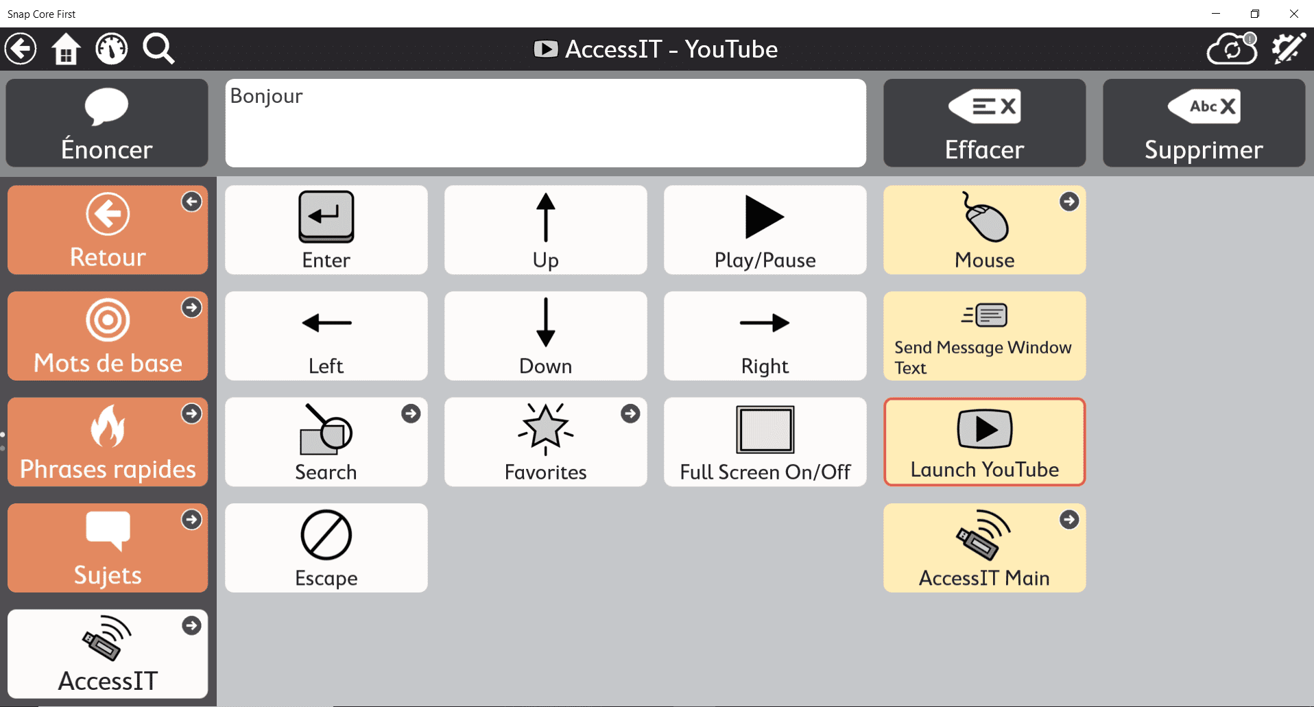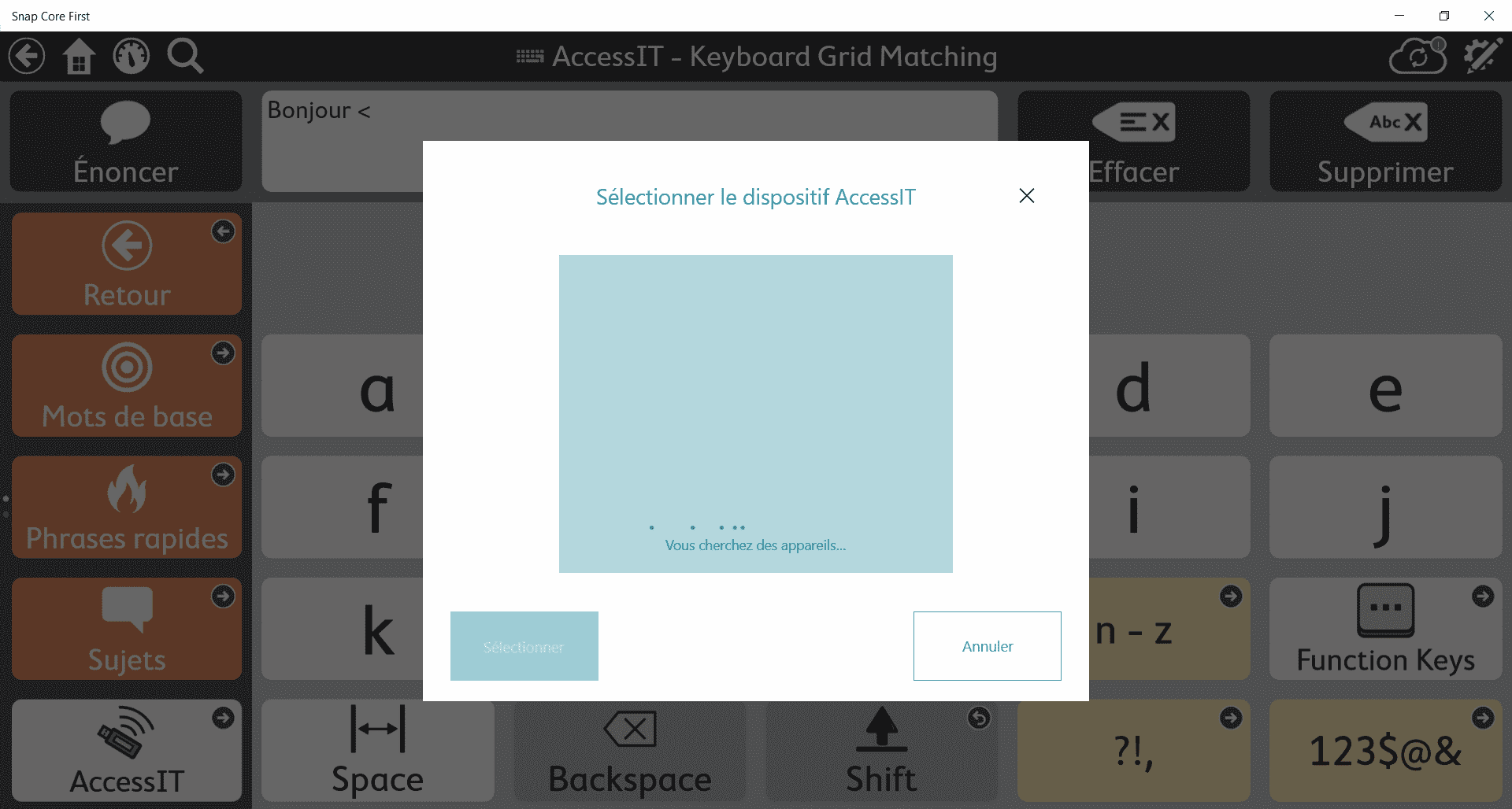L’AccessIT 3 connecté à l’ordinateur va permettre de contrôler le curseur souris, utiliser le clavier et les pictogrammes de l’application Snap Core et retranscrire le message sur l’ordinateur dans un traitement de texte ou pour écrire un mail.