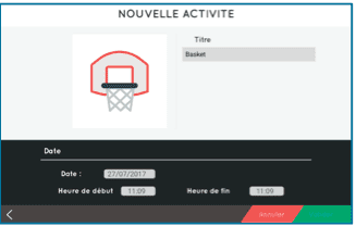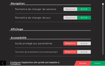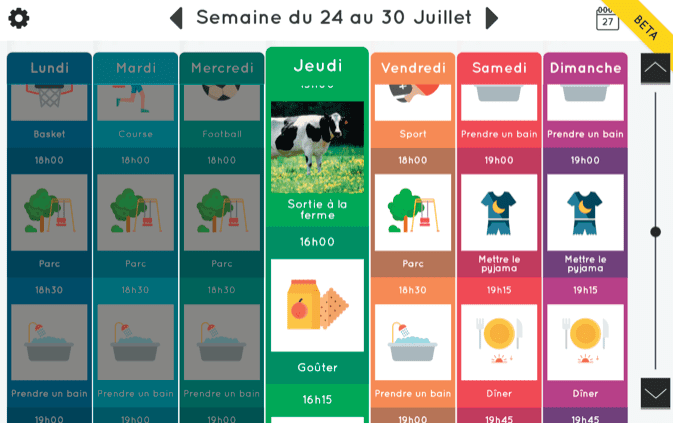 Sur la page de la semaine,on entend le nom des activités en touchant l’image correspondant. L’image s’agrandit, en même temps qu’un deuxième feed-back auditif. L’activité terminée, l’enfant peut appuyer sur la touche verte pour obtenir un « bravo ». L’activité se grise alors ; une barre et un cadre noirs en signifient la fin.
