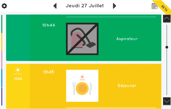 On passe de l’une à l’autre avec la touche calendrier (petite) située en haut à droite. L’enfant glisse verticalement pour dérouler sa journée, ou utilise les flèches haut et bas. Les flèches encadrant la date permettent de passer d’un jour ou d’une semaine à l’autre.