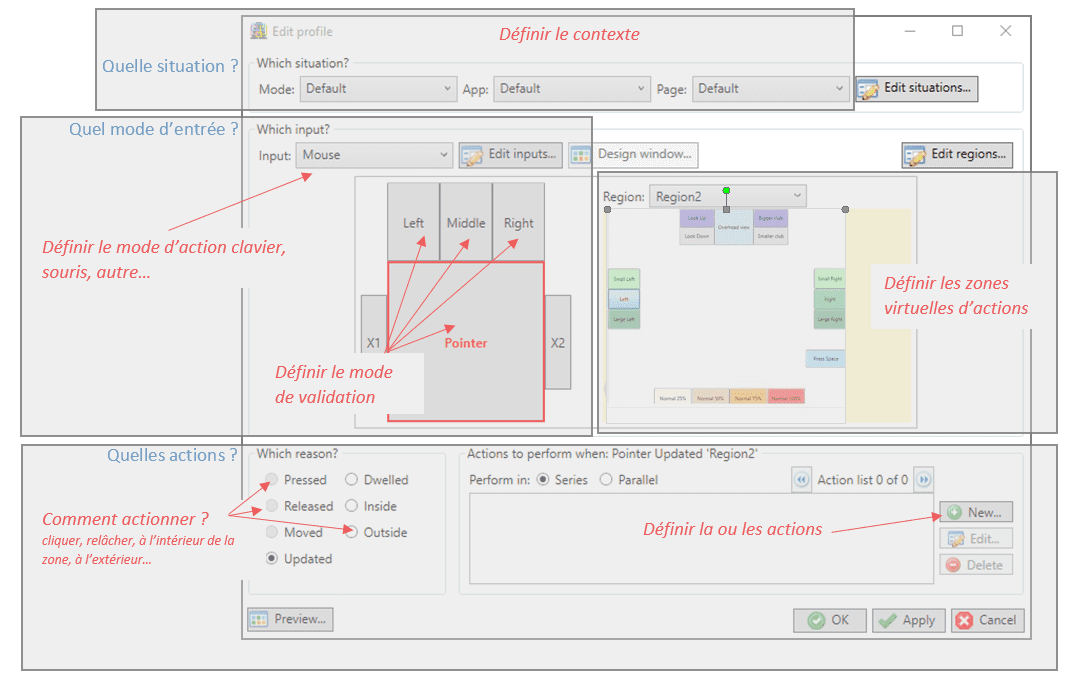 Pour chaque situation d’usage, vous aurez la possibilité de choisir un mode d’entrée, et un mode de sélection et d’y allouer une ou des actions.