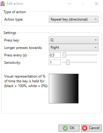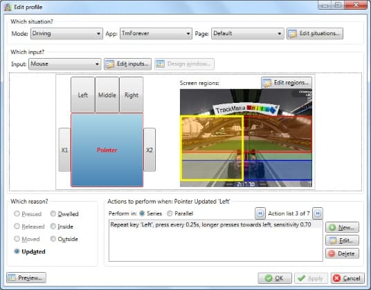 La méthode de validation est assez large, il vous est possible d’activer au survol/dwelled (fonction la plus connue) ainsi que cliquer, relâcher, à chaque mouvement, à l’intérieur ou à l’extérieur du cadre. Enfin, l’action à mettre en place lorsque toutes les options précédentes sont réunies est à déterminer ici. Il peut s’agir d’une macro de touche successives ou concomitantes. Il est également possible de moduler l’action selon la zone, par exemple au plus mon curseur va vers le haut de la zone définie, au plus mon véhicule accélèrera (fonction « updated »).