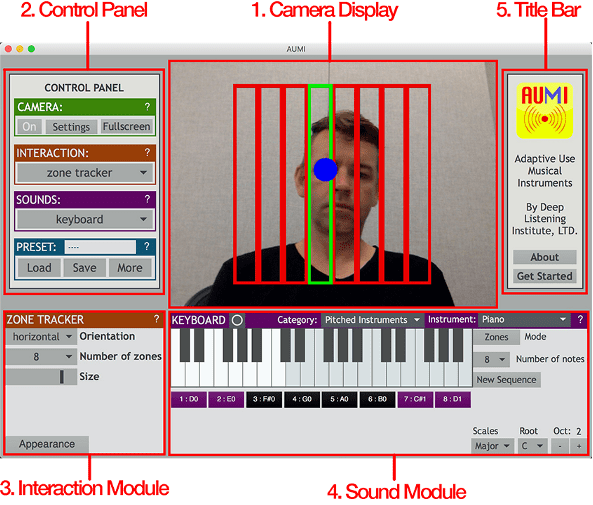 L’interface du logiciel permet à l’utilisateur de jouer des sons et des phrases musicales à travers les mouvements et gestes capturés par la webcam intégrée ou connectée à un ordinateur, Mac ou PC.