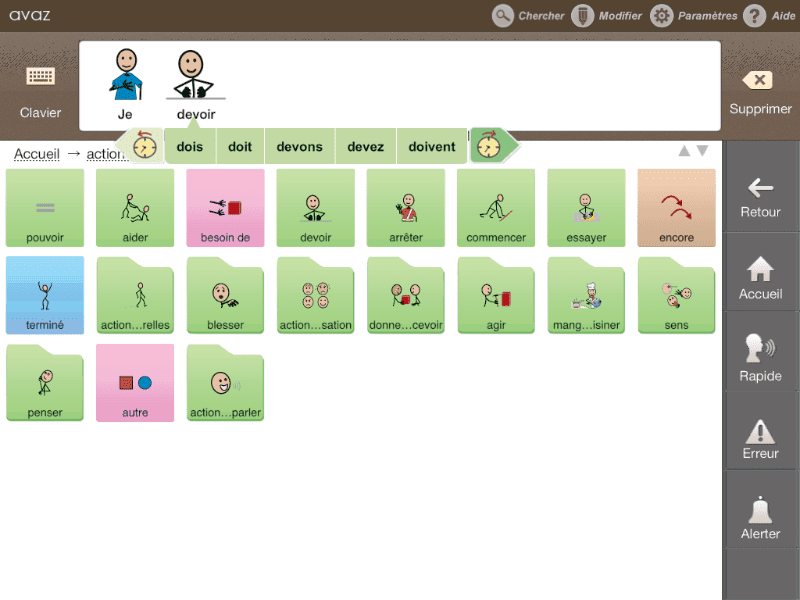 Pour l’utilisateur qui sait lire et écrire, Avaz ne propose pas de correcteur orthographique automatique mais il peut faire des choix d’accords grammaticaux (nom, verbe, adjectifs) et temporels (passé, présent, futur). Une bulle de prédiction apparaît alors sous les mots saisis.