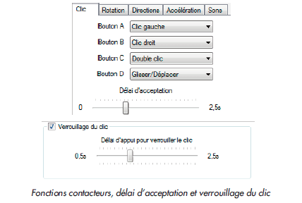 Afin d’éviter les clics intempestifs, il est possible de régler le délai d’acceptation, selon la valeur choisie : il faudra maintenir l’appui une durée paramétrable avant de déclencher le clic.