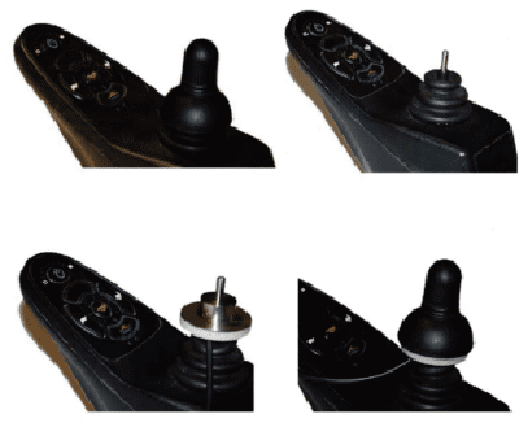 Elle se présente comme un petit joystick métallique qui s’emboîte sur l’axe du joystick du fauteuil roulant et se fixe par serrage.