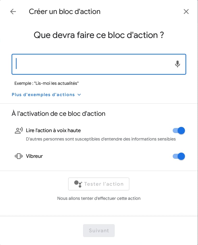 Techniquement, les « Blocs d’actions » ne sont qu’un moyen graphique et tactile d’interagir avec l’assistant Google, conçu initialement pour être commandé à la voix. Cela permet de rendre accessibles toutes les fonctionnalités d’un assistant vocal à ceux qui n’en ont pas l’usage d’ordinaire. En contrepartie, cela signifie que pour déclencher une action, le téléphone ou la tablette doit disposer d’une connexion donnée active (3G / 4G ou wifi).
