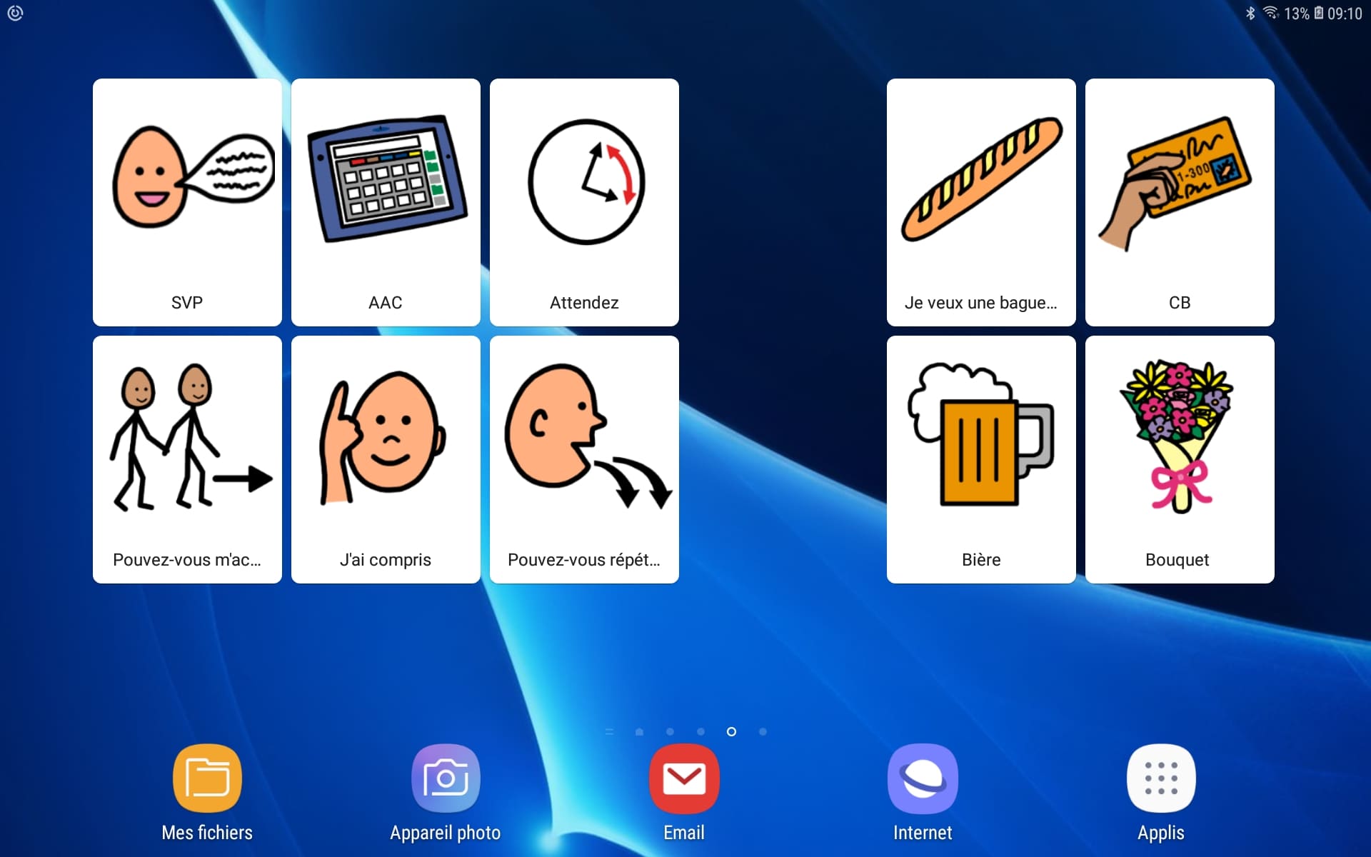 Notez qu’il ne s’agit pas de remplacer un logiciel d’aide à la communication complet, mais de permettre l’émission rapide de messages préparés.