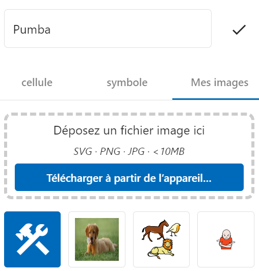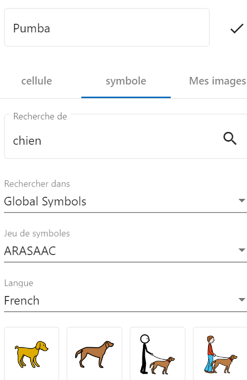 En appuyant sur une cellule, un bandeau apparait à droite, il faut cliquer sur “symbole”. Il est alors proposé de nommer l’étiquette et le mot de recherche. L’étiquette et le mot de recherche peuvent être différent. La recherche doit se faire en anglais (car le picto souhaité n’est pas traduit dans sa langue) mais le mot doit être écrit en français. Par exemple, si le chien de Léa s’appelle Pumba, l’étiquette sera Pumba mais on recherchera un chien. L’idéal sera cependant d’ajouter, non pas un picto général de chien mais la photo personnelle de Pumba (avec mes images).