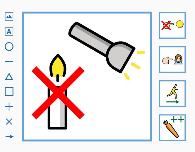 Le bouton bleu et blanc avec des outils correspond à Symbol Creator qui permet de créer ses propres symboles en combinant formes (croix, cercle, flèche…), texte, pictogrammes ou images personnelles.