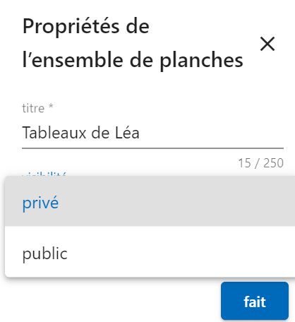Les 3 points verticaux à côté de l’ensemble des tableaux donnent accès aux propriétés permettant de choisir de classer les tableaux en public (visible par tous) ou privé.