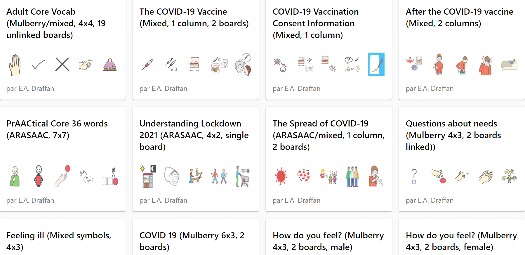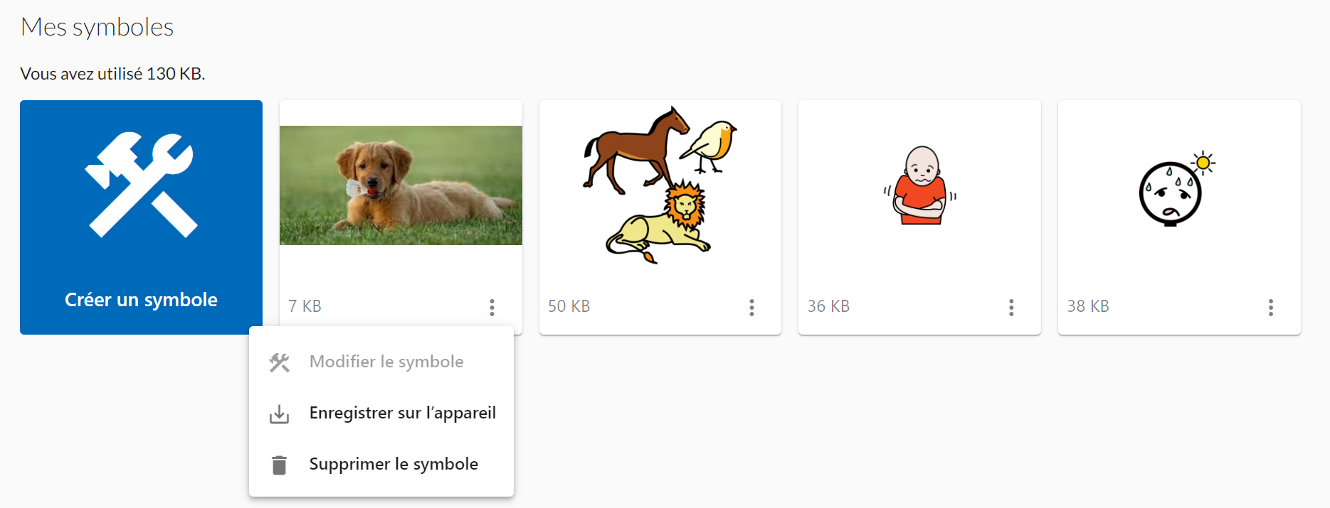 Des images personnelles ou des pictogrammes issus de Global Symbols , Open Symbols et The Noun Project peuvent être utilisés dans les tableaux créés.