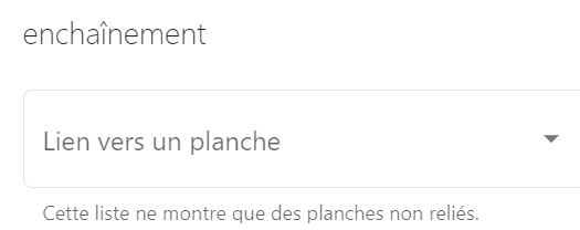 Dans ce bandeau, on peut lier une case à un autre tableau : “Enchaînement”>”lien vers une planche” (liste des tableaux non reliés créés.)