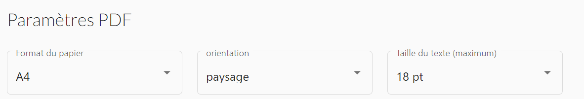 Il faudra parfois réduire la taille de la police quand il y a trop de cellules / format du papier pour une impression complète. Les paramètre PDF sont proposés dès qu’on choisit d’imprimer ou de télécharger en PDF.