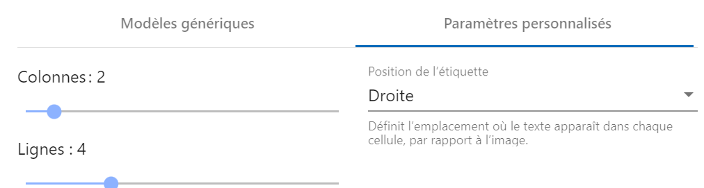 Il faut ensuite donner un titre au 1er tableau puis on choisit la disposition souhaitée soit parmi les modèles génériques, soit en personnalisant les paramètres. “Paramètres personnalisés” permet de définir le nombre de lignes et de colonnes et la position du mot écrit dans chaque cellule (fond (en bas au centre), Droite, Gauche, caché). Il serait intéressant de pouvoir placer le mot écrit en haut de la cellule si nécessaire.