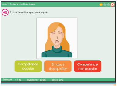 1 :Imiter une image, ou une photo. Le thérapeute clique alors sur « notion acquise, en cours d’acquisition, non acquise ». La demande est formulée vocalement si c’est utile.