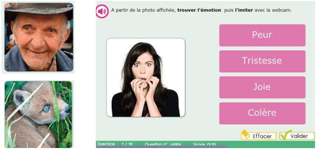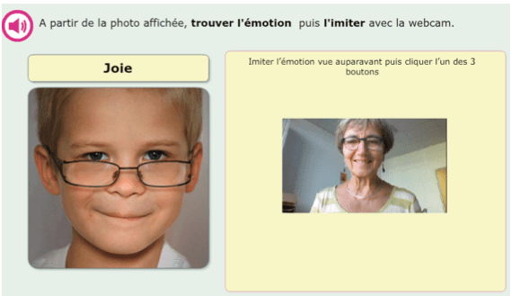 2 :Reconnaître et désigner l’émotion montrée en photo, puis imiter et enregistrer avec la caméra son visage avec la même émotion. Il est nécessaire d’autoriser l’accès à la web cam.