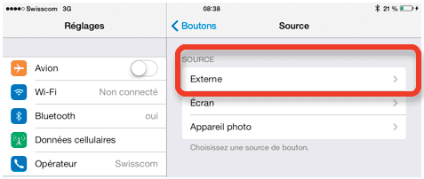 Retourner dans Général > Accessibilité > Contrôle de sélection > Boutons > Ajouter un bouton. Activer « bouton externe ». Le clavier qui s’ouvre permet de nommer le bouton Blue2. Il est recommandé de lui donner un nom facile à retenir au cas où on en utilise plusieurs. Par ex. « Blue2Jaune ». Enregistrer.