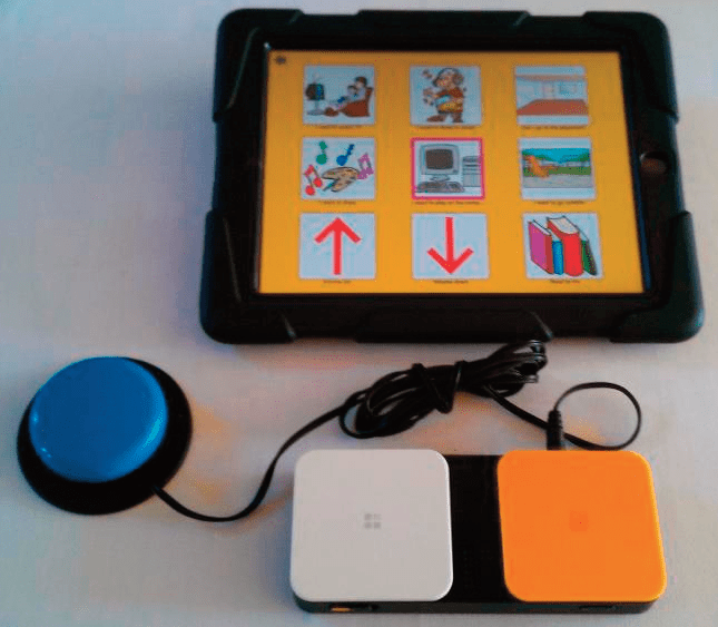 Avec les fonctionnalités d’accessibilité décrites dans la fiche précédente, des contacteurs sont à présent connectables sur iPad avec IOS7, dont ce contacteur BlueTooth « Blue2 ». Tutoriels en anglais en ligne sur Ablenet :