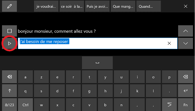 Deux boutons (flèches monter et descendre) permettent de sélectionner les phrases mémorisées. Le bouton en forme de crayon, permet de modifier l’accès aux cinq phrases rapides accessibles en haut d’écran. Ce module est principalement destiné à vocaliser une phrase rapidement écrite en session de travail, ce qui en soit est très appréciable, mais assez limité en matière d’aide à la communication par rapport aux solutions proposées au sein de logiciels spécialisés, compatibles et optimisés avec les dispositifs de commande oculaire du marché des aides techniques.