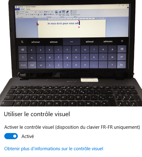 Le Contrôle Visuel de Windows utilise son propre clavier désormais corrigé dans la mise à jour de Mai 2020 (version 2004), mais il est possible de composer du texte avec d’autres claviers compatibles : Click2Speak (Fiche technique 04-270), Optikey (Fiche technique 04-272), Mill Mouse (Fiche technique 03-157).