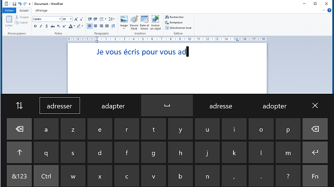 Pour écrire du texte, fixer le regard sur le bouton clavier du launchpad, puis fixer les caractères que l’on souhaite saisir. Le clavier intégré à l’application n’est pas le traditionnel clavier visuel de Windows mais comporte également un mode prédiction des mots en cours de saisie affiché au dessus du clavier.