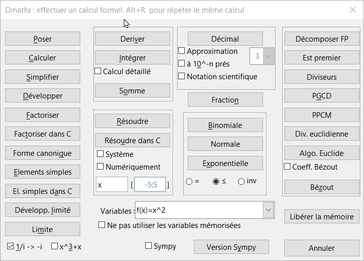 Dmaths intègre la possibilité d’utiliser un moteur de calcul formel directement depuis le traitement de texte. Qu’est-ce que ça veut dire ? Cela signifie que non seulement Dmaths vous permet de saisir des énoncés, mais qu’il peut également résoudre les opérations et équations ! Pour des choses triviales, cela fait gagner un peu de temps ; pour des problèmes plus complexes, c’est une aide précieuse !