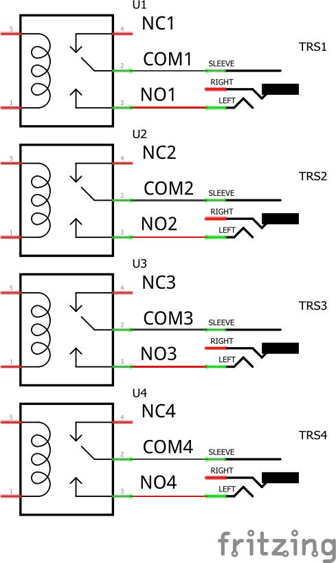Pour obtenir un dispositif équivalent à la BJ Toy Box ou au iControl, nous allons connecter aux relais des connecteurs TRS jacks 3,5 mm femelle munis également de borniers à vis. Pour ce faire, il vous faudra de simples câbles à 2 brins séparés.