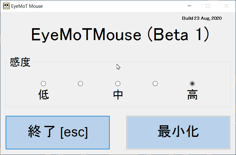 Pour que le pointeur de la souris suive le regard, il faut tout d’abord lancer l’utilitaire EyeMoTMouse qui se trouve dans le répertoire éponyme. Vous pouvez afficher la fenêtre de l’application qui affichent des informations en japonais. Pour modifier la vitesse de déplacement du curseur, vous pouvez cliquer sur les boutons radions situés au centre de la fenêtre : vers la gauche, la souris est très lissée, vers la droite, elle suit les saccades oculaires, ce qui peut être un peu perturbant. Le bouton en bas à gauche quitte l’application, en bas à droite, la minimise dans la barre des tâches.