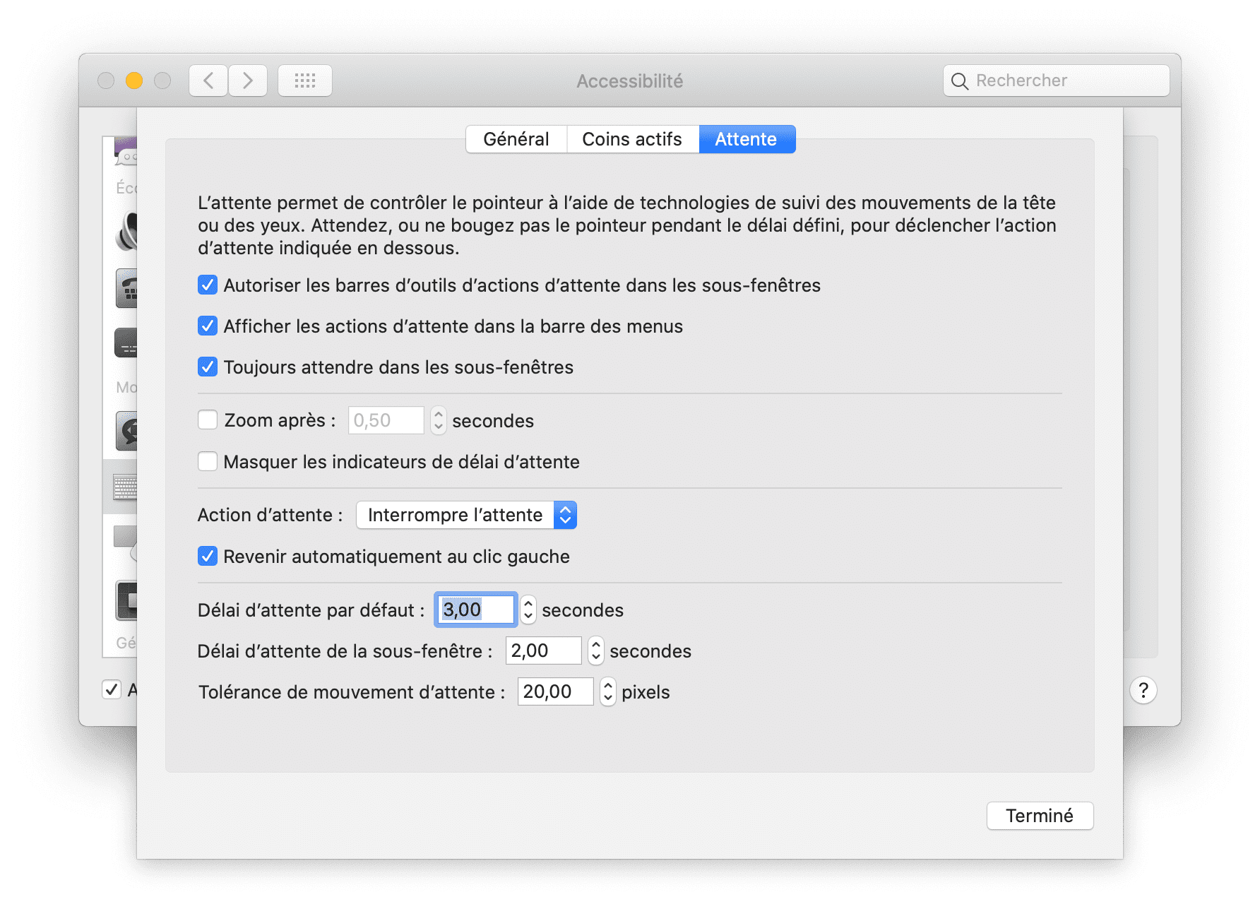Dans préférences système, cliquez sur Accessibilité, puis sur Clavier / sélectionnez « activer le clavier d’accessibilité » Le bouton « options » puis « attente » permet d’accéder aux outils de personnalisation. Il est ainsi possible de choisir :