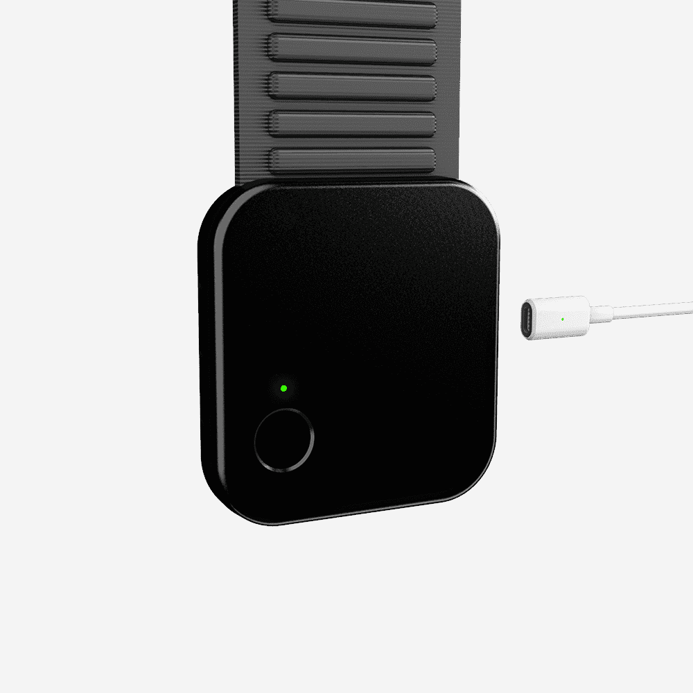Un petit boitier contenant son « intelligence » et sa batterie est rattaché à l’extrémité du tapis. Il y a un seul bouton pour se connecter et transmettre toutes les informations. Votre smartphone reçoit les données en temps réel.