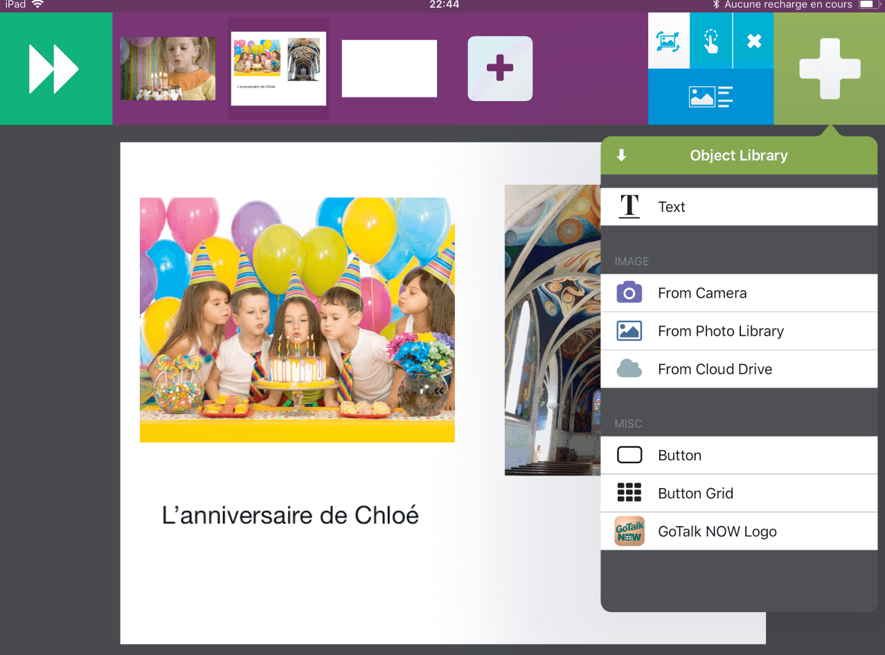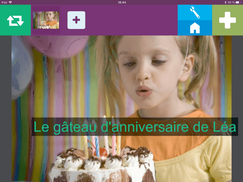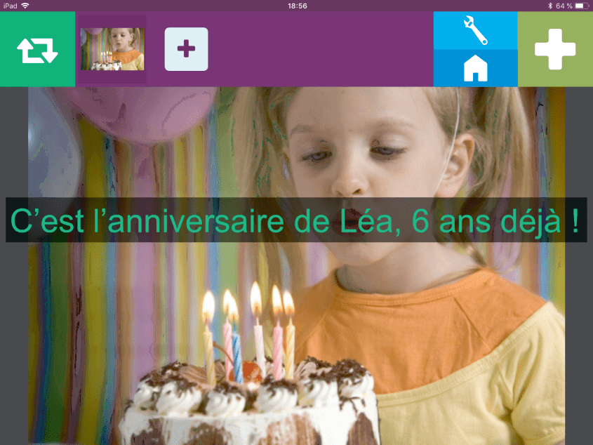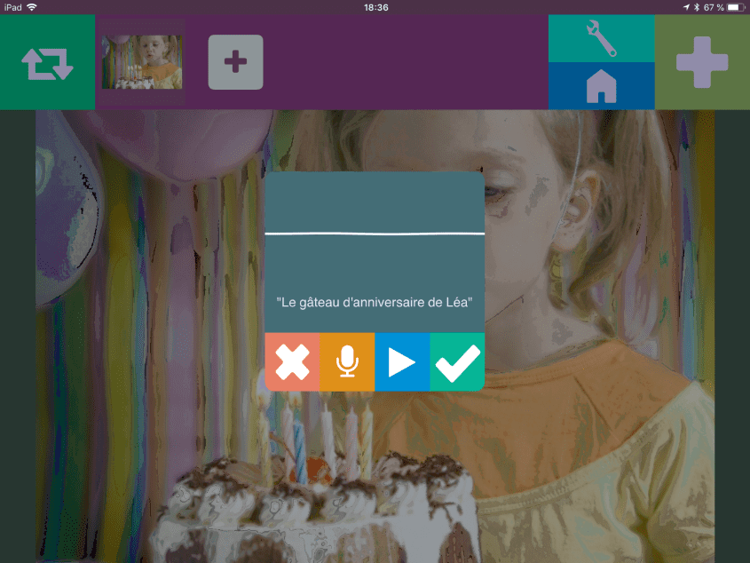 A ce stade, l’activité en cours est fonctionnelle : au lancement de l’activité, le marqueur est affiché pendant 3 secondes, puis s’estompe. Un clic sur l’image du gâteau déclenche la phrase enregistrée et l’affichage du texte correspondant. Si souhaité, créer d’autres marqueurs sur la même page : dans notre exemple : « c’est l’anniversaire de Léa, six ans déjà ». Une scène peut contenir jusqu’à 20 marqueurs.